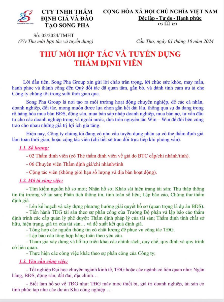 Cty Thẩm Định Giá Song Pha tuyển nhân sự có thẻ thẩm định giá, hoặc chuyên viên về giá trên các địa bàn của Việt Nam.