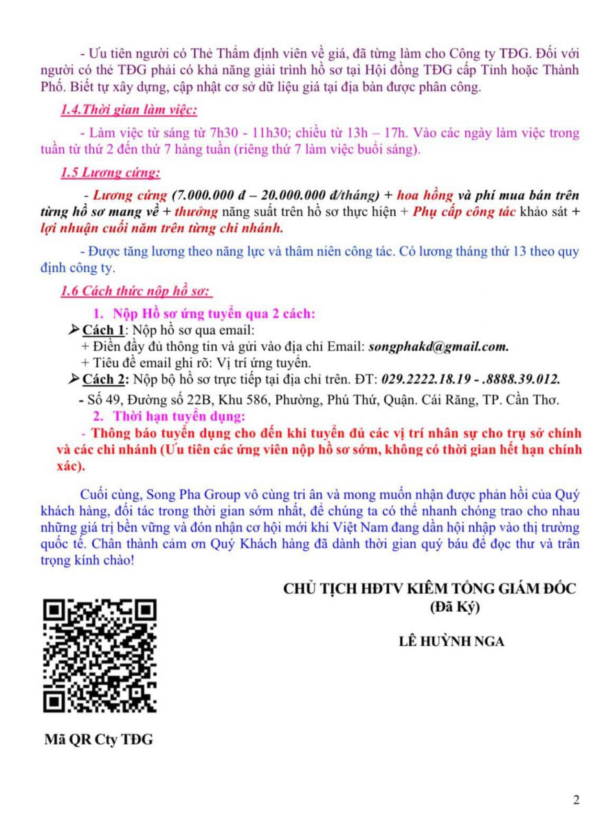 - Thông báo tuyển dụng cho đến khi tuyển đủ các vị trí nhân sự cho trụ sở chính và các chi nhánh (Ưu tiên các ứng viên nộp hồ sơ sớm, không có thời gian hết hạn chính xác).