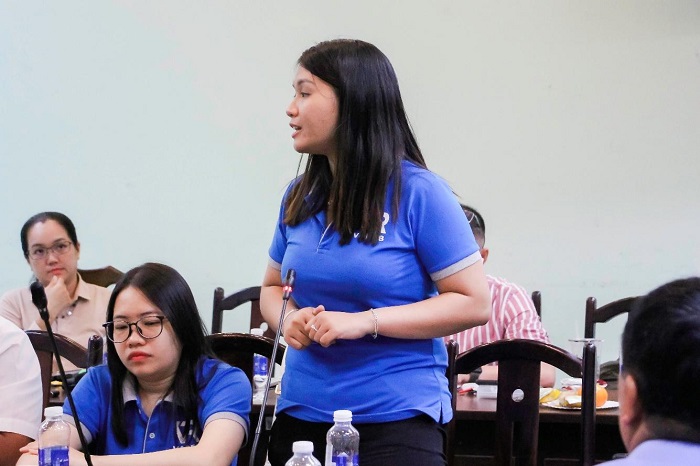 Cựu sinh viên Phùng Thị Trúc Ngân, lớp 15DKB1 phát biểu tại Hội nghị