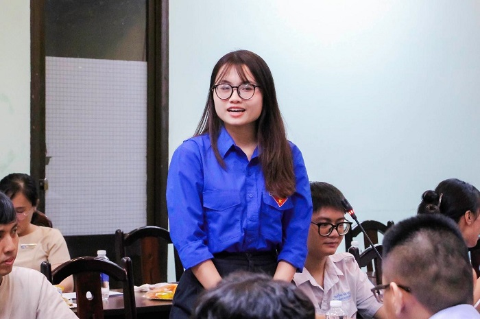 Sinh viên Lê Thị Kim Ngân, lớp 20DTD, Liên chi hội trưởng Khoa phát biểu